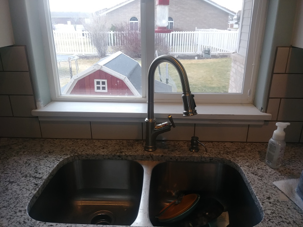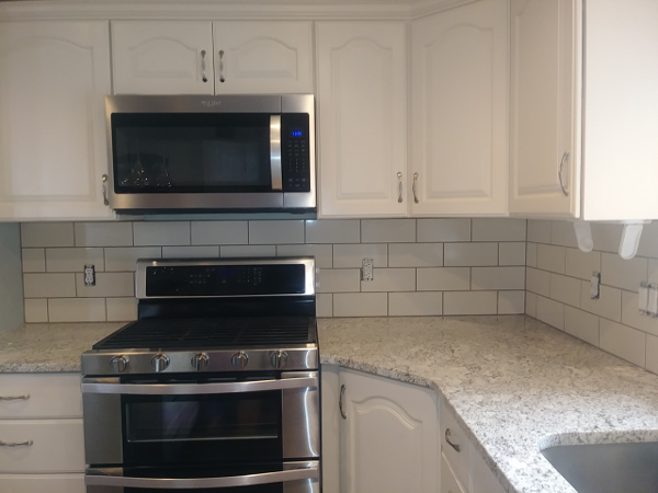 Tile backsplash with subway pattern.