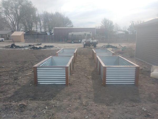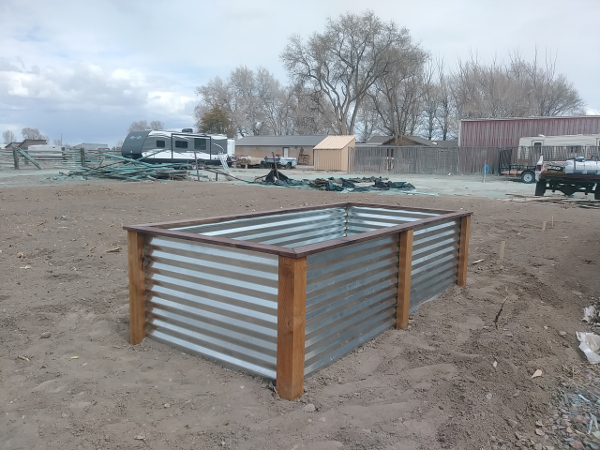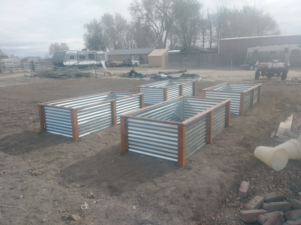 Raised garden beds made with corrugated steel panels and weather treated 4x4 posts with top rail.