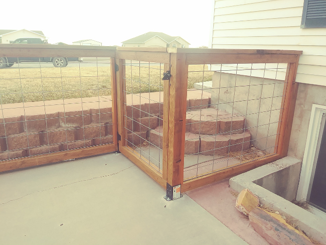 Fence made with weather treated 4x4 posts and 2x4. With cattle fencing and top rail.